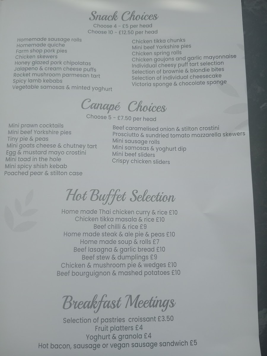 The menu at Thyme for food café & Events offers a variety of options suitable for different times of the day, including breakfast, light meals, and snacks. The selection includes freshly prepared hot and cold food items, with an emphasis on traditional dishes and bakery items.